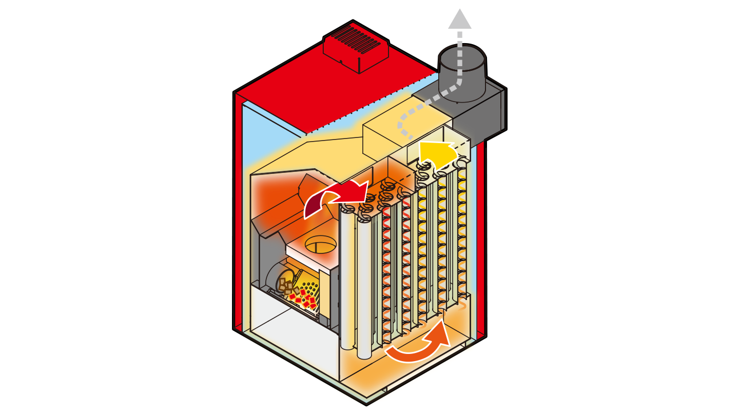 二次燃焼された燃焼ガスが熱交換部煙筒内のスクリューに沿ってラセン状に旋回することにより、効率よく熱交換することができます。