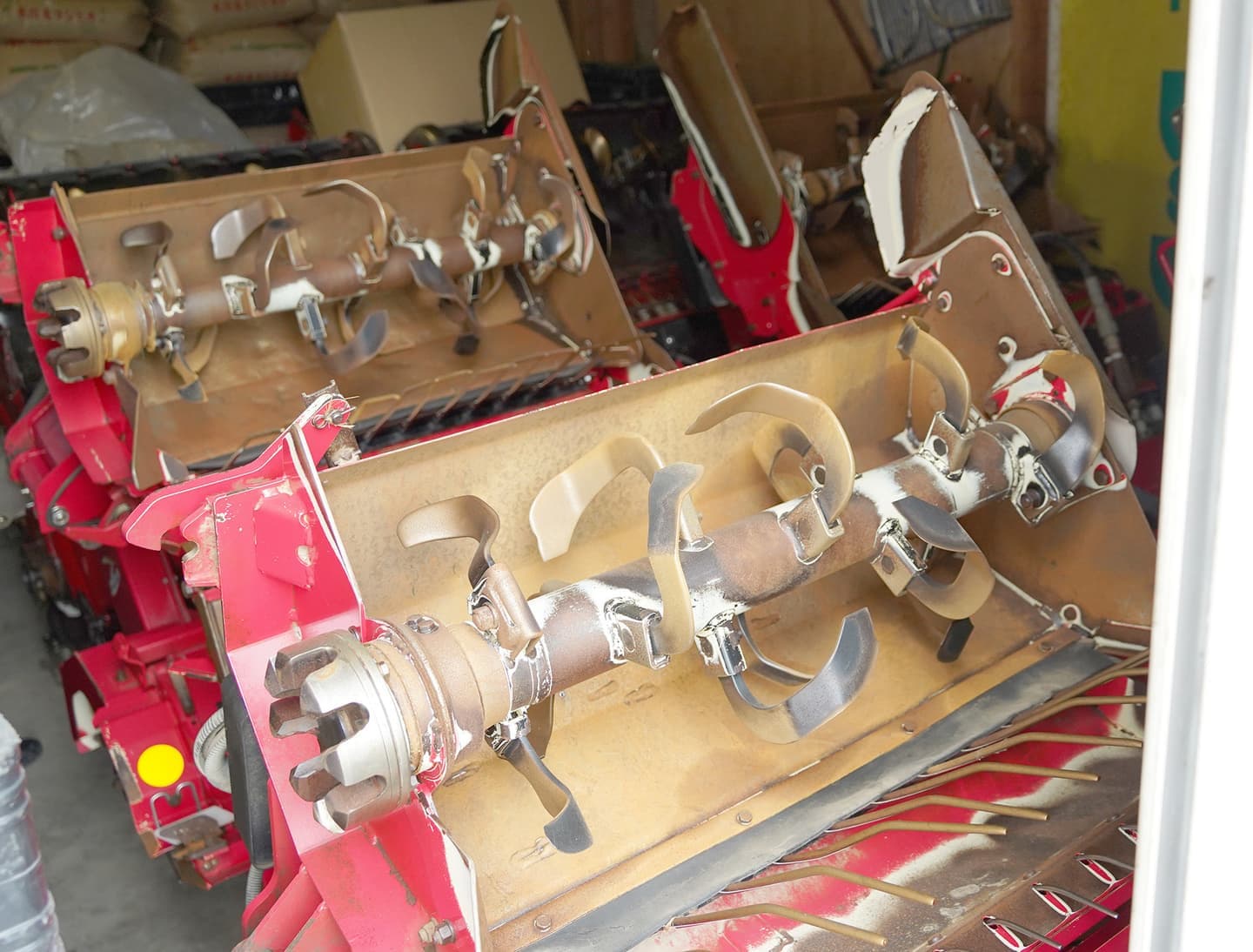 キが第一レベラーに交互に並んでいることにより、稲株やわら、土塊を2段階で確実にスキ込む。納得のスキ込み性はササキ超耕速の独自構造によるものだ。