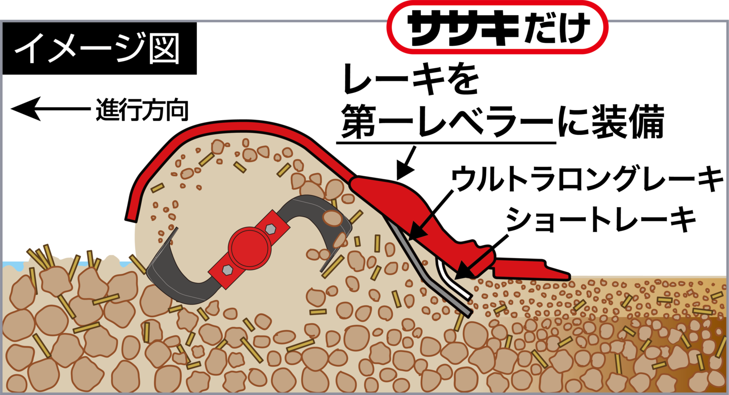 ササキの超耕速マックスハローACEは、外側へ逃げる泥の流れをシャットアウトする「フロントウェーブガード」がわらや土を逃さず内側へと導く。また、独自の可変式一体型ウルトラロングレーキとステンレスショートレー