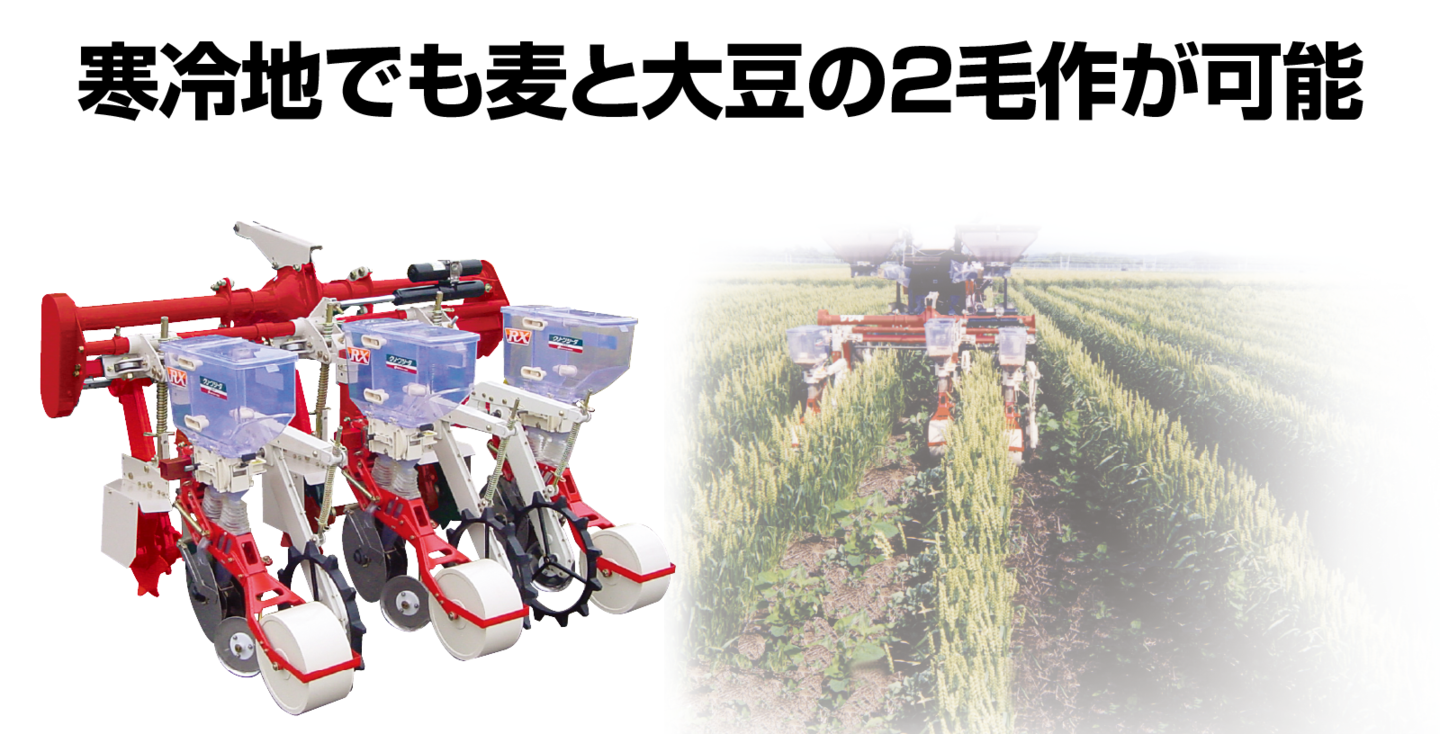 収穫前の小麦の畦間に大豆を、大豆の畦間に小麦を播種する立毛間播種栽培により寒冷地での2毛作が可能となりました。