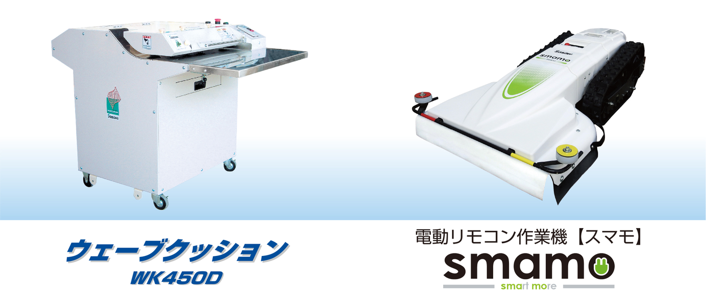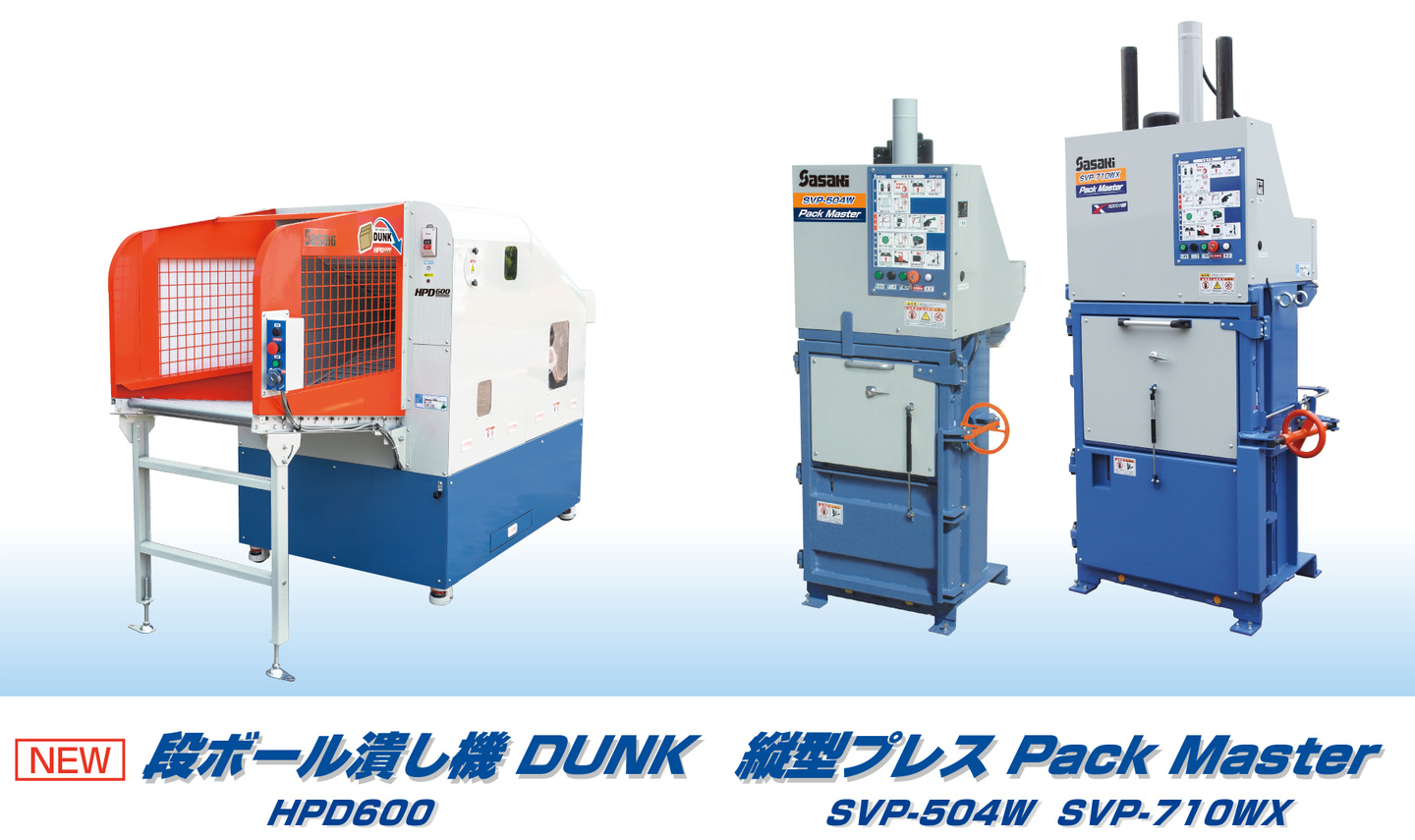 新型ハイパワーモデル「段ボール潰し機 DUNK HPD600」、「縦型プレス機 SVP-504W/710WX」、「緩衝材製造機 ウェーブクッション WK450D」、「電動リモコン作業機 スマモ」を出展いたします。