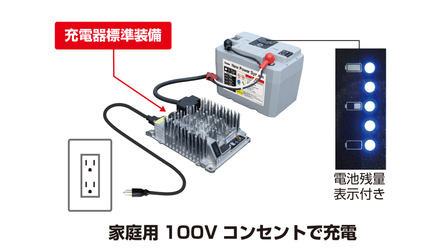 着脱式のリチウムイオンバッテリーは充電時、走行ユニットから取り外して、家庭用100V(2 極接地極付 )コンセントで充電可能です。充電時間はおよそ2時間。1回の充電にかかる電気料金は約20円と経済的。(バッテリー 1 個の時)